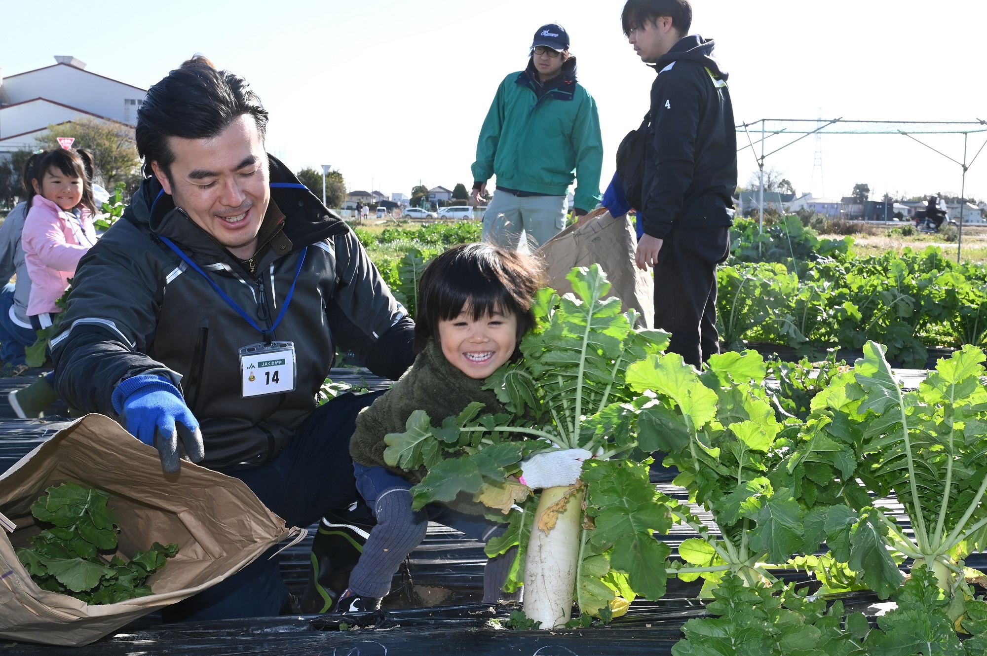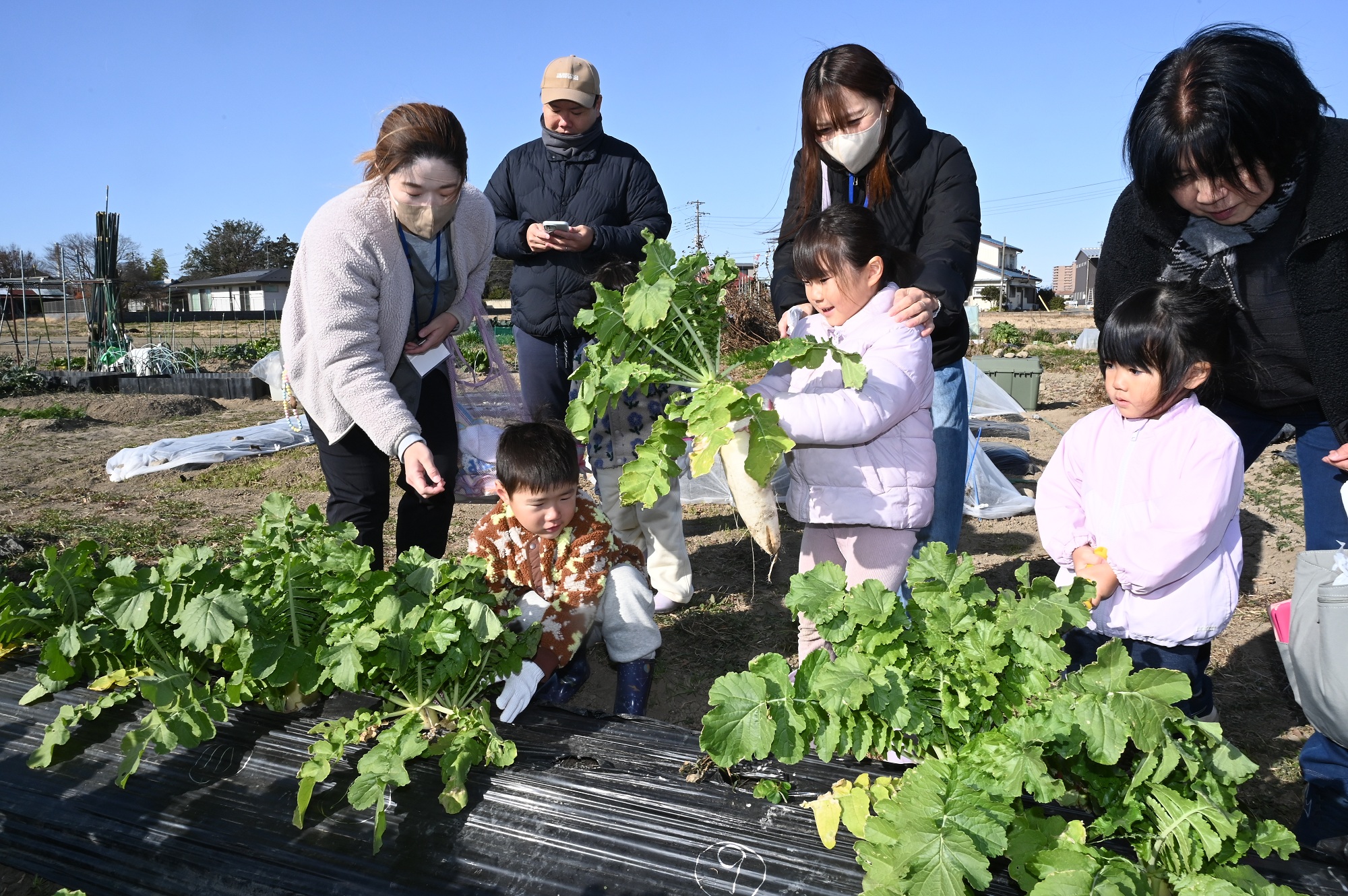 当JAは13日、JAが管理する市民農園「ふれあい農園」で、ダイコンの収穫体験を開きました。19組54人の応募者が参加し、晴天の下、ダイコンの収穫を楽しみました。