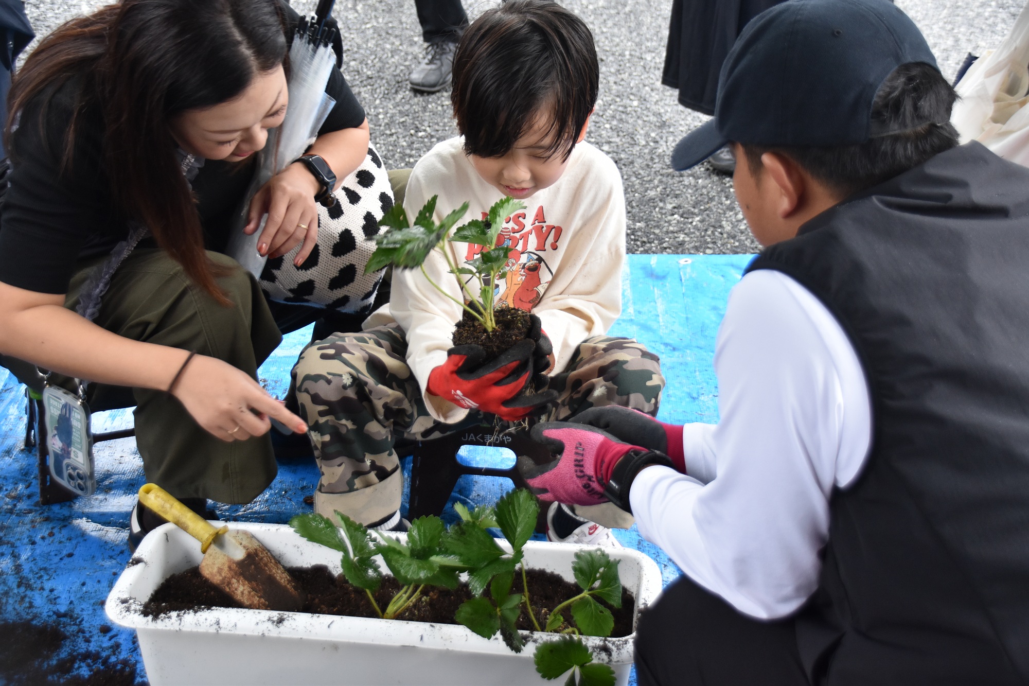 また、当JAから佐久良支店の職員が地域連携活動として参加。活動組織の役員が育てたイチゴ苗をプランターに植える農業体験の指導や、農産物の販売、児童向けのゲーム等を行い、多くの来場者で賑わいました。