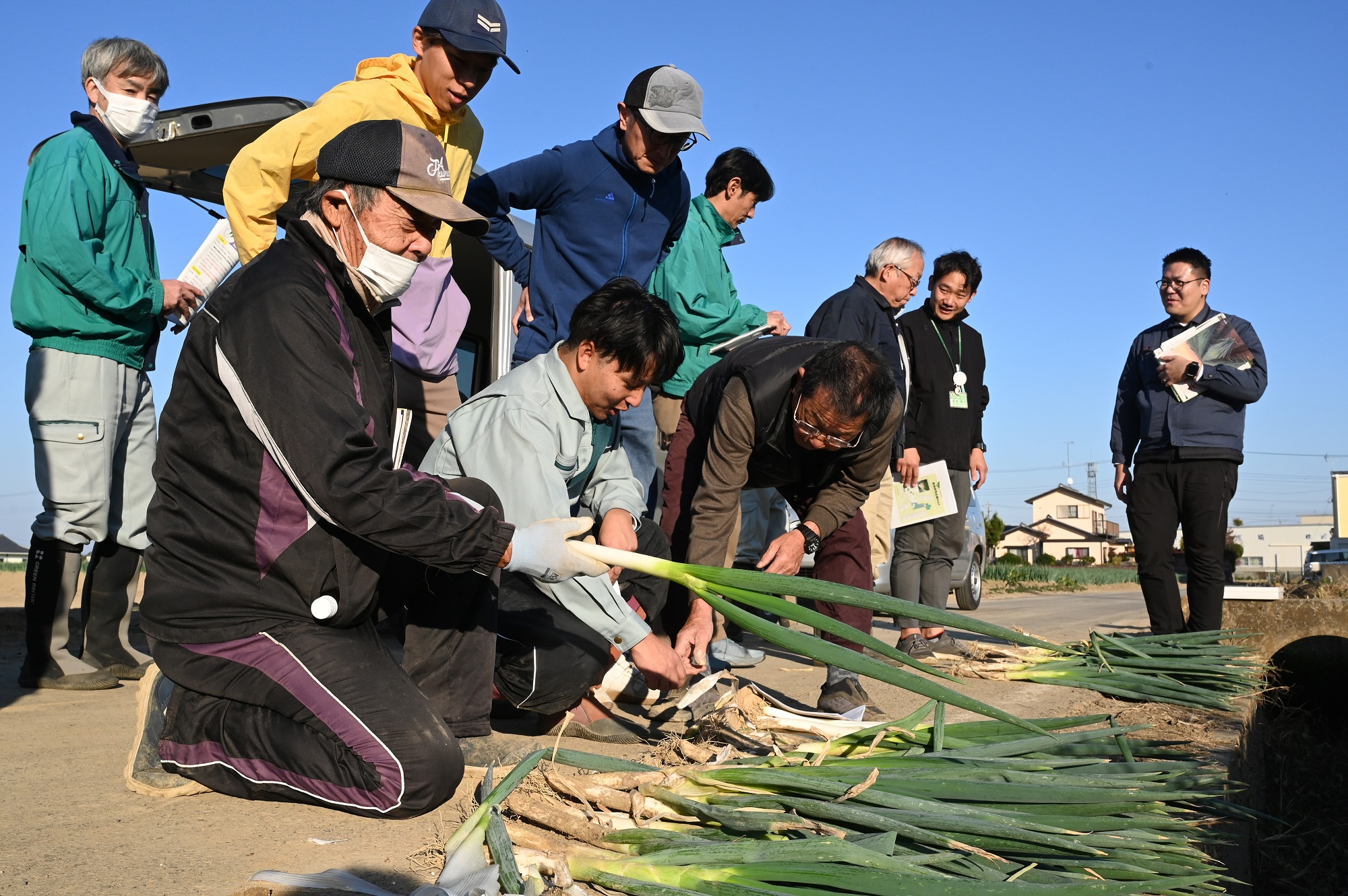 当JAは20日、熊谷市妻沼地区の圃場で、昨今の気候変動に伴うネギの品種比較検討会を開きました。生産者や大里農林振興センター、全農埼玉県本部、種苗メーカー、JA担当者が参加し意見交換をしました。
