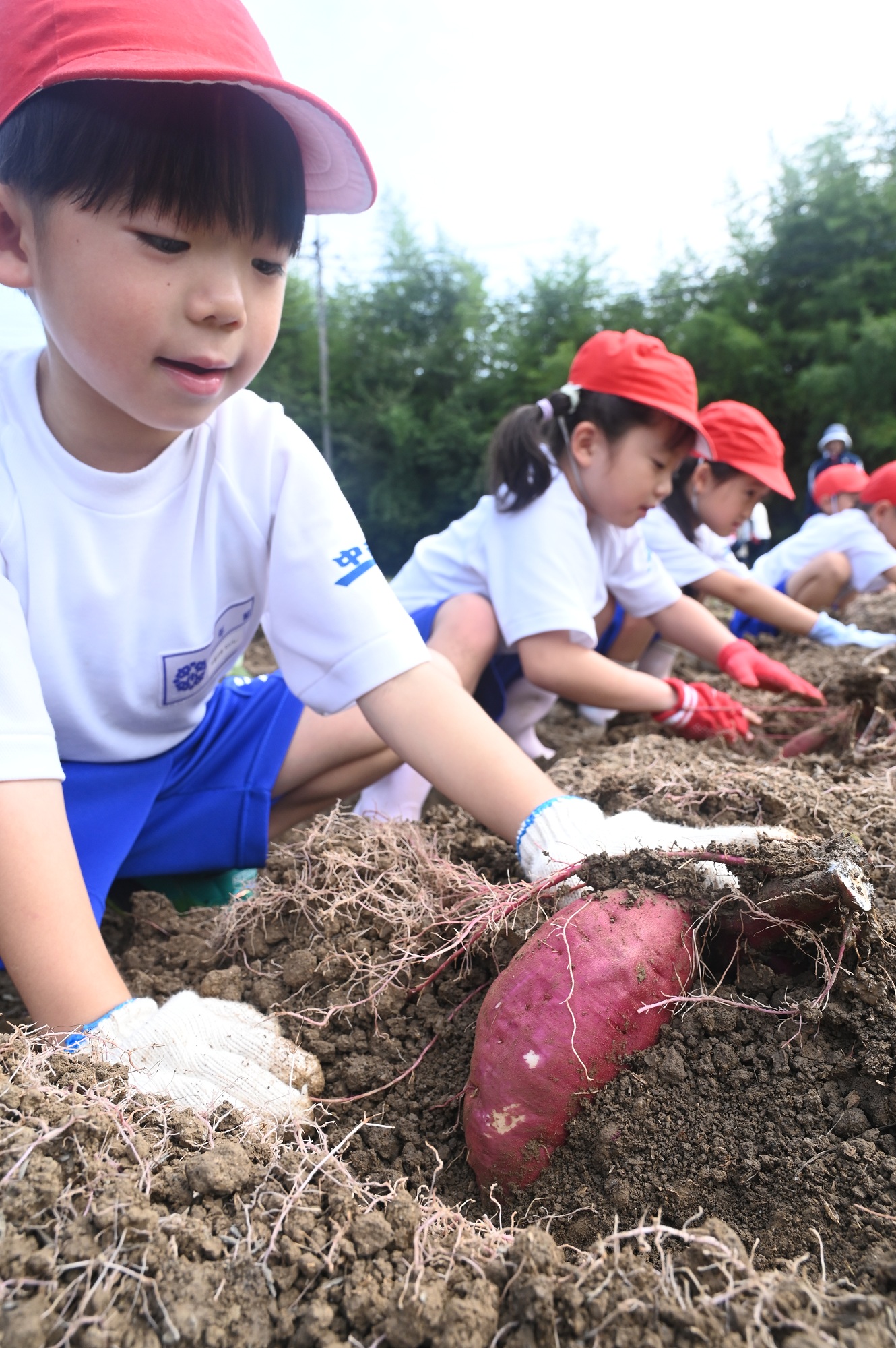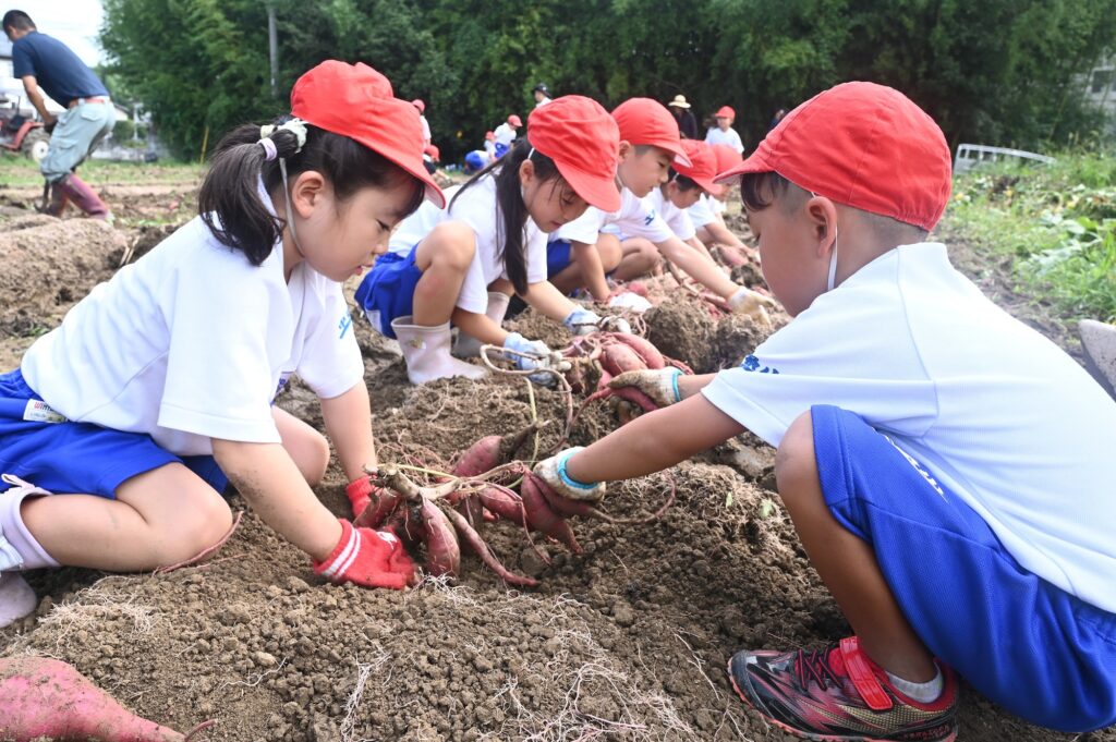 熊谷市立中条小学校は16日、同小学校に隣接する圃場で1、2年生の児童38人を対象としたサツマイモの収穫体験を行いました。