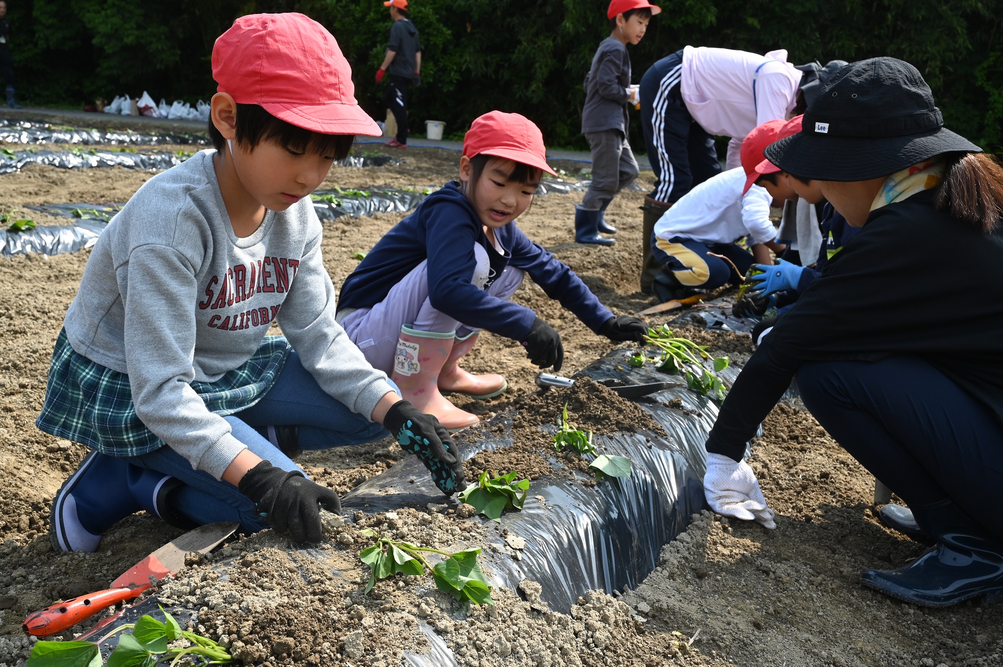 当日は東部営農経済センターの石橋友輔さんが苗の植え方を説明。その後「紅あずま」「紅はるか」の苗580本を、先生や地元農家、JA職員サポートのもと植えていきました。
