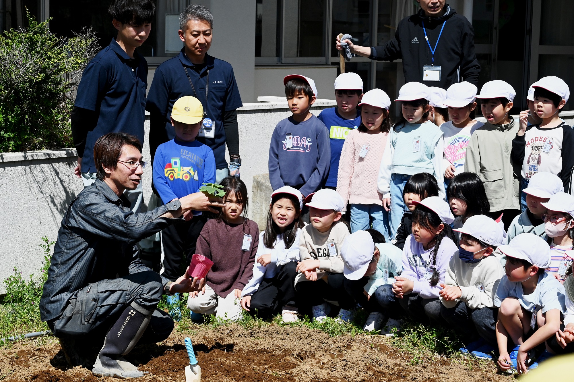 体験では、鯨井さんが同校の児童125人に「ロロン」の特徴や栽培方法などを説明。その後、提供した14個の苗を児童たちがグループに分かれ協力しながら植えていきました。