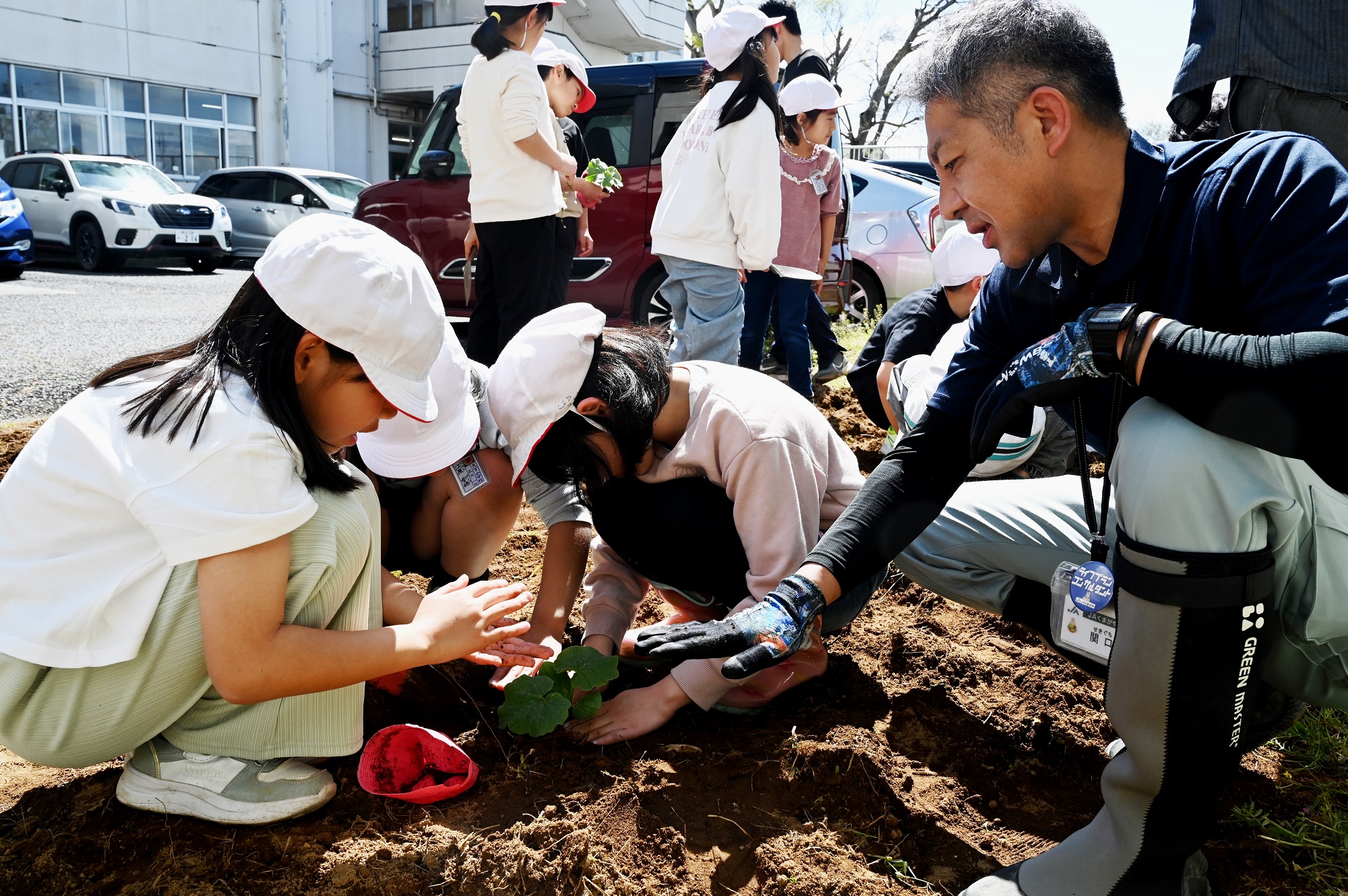 熊谷市立久下小学校は14日、同校敷地内の圃場で、ラグビーボール型カボチャ「ロロン」の苗植え体験を行いました。当JA佐久良支店と東部営農経済センターの職員も地域連携活動として参加しました。