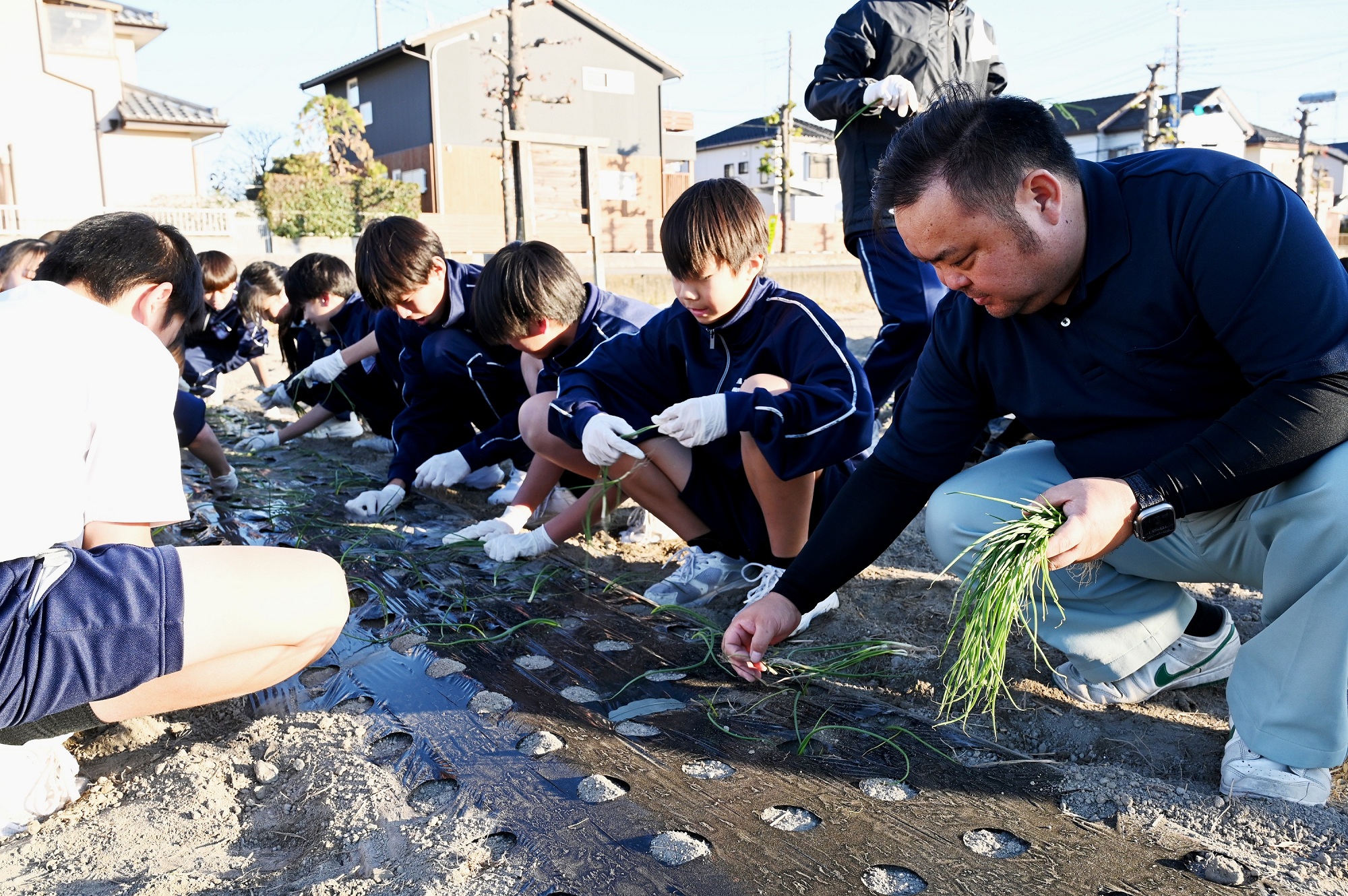 熊谷市立大幡中学校の1年生生徒81人は17日、玉ねぎ苗の植え付け体験を行いました。