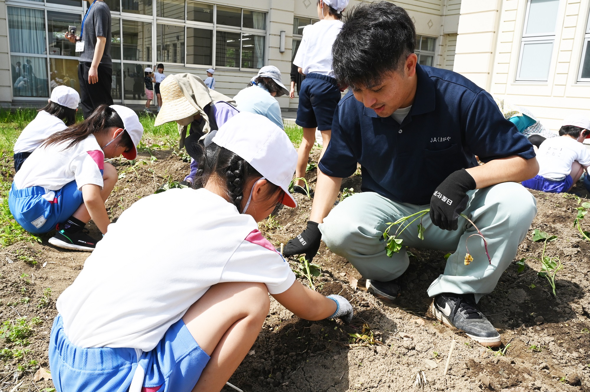 苗植えに参加したのは2年生児童29人。JAくまがやから妻沼西支店、北部営農経済センター、女性部長井支部が地域連携活動として参加し児童の作業をサポートしました。