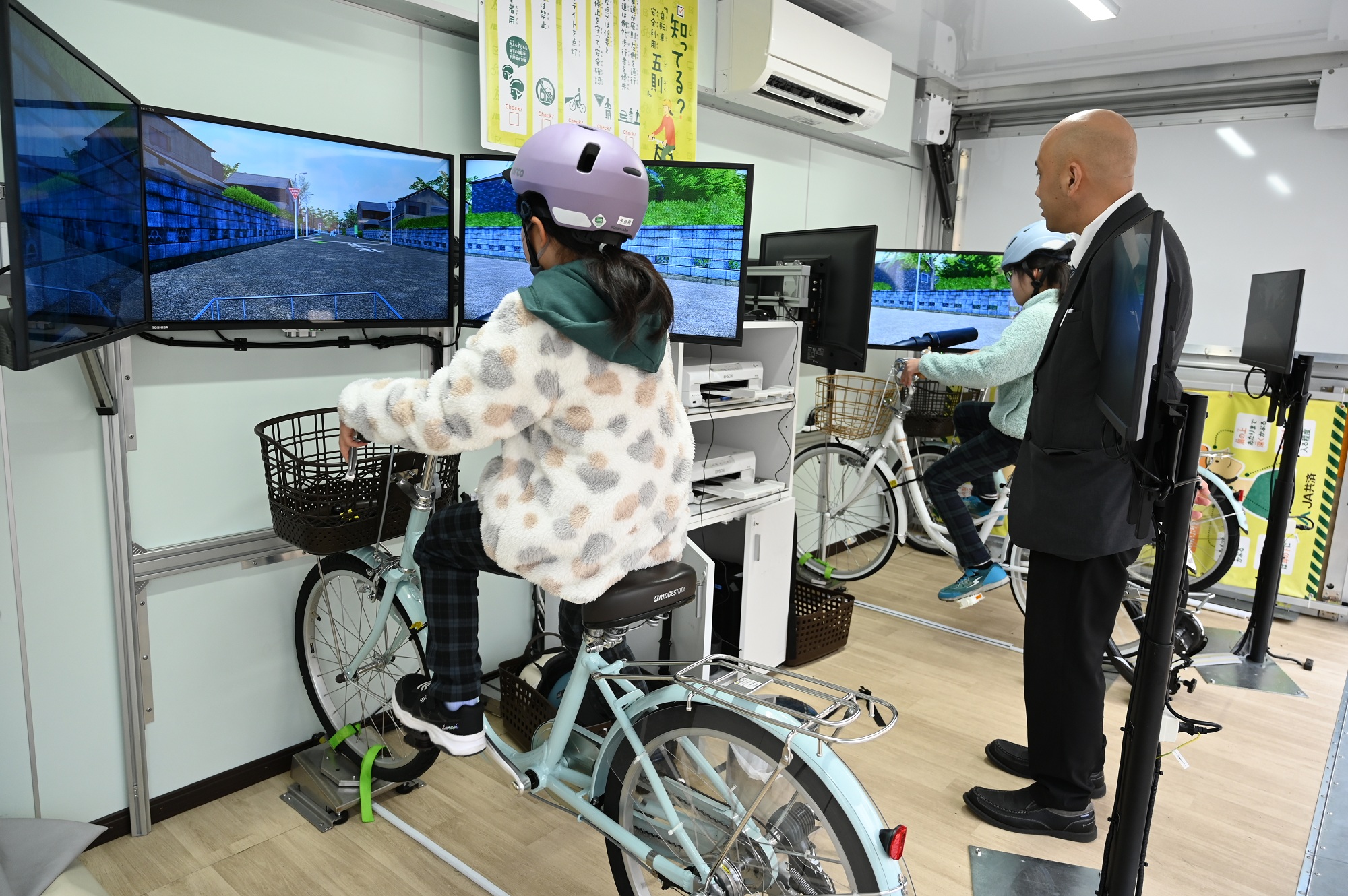 児童たちはセンサーを装着した実物の自転車に乗り3面のモニターに映し出される映像を確認しながらシミュレーションを行いました。実際の走行時に近い感覚で運転し、危険な体験を通して交通ルールや危険予測について学習しました。