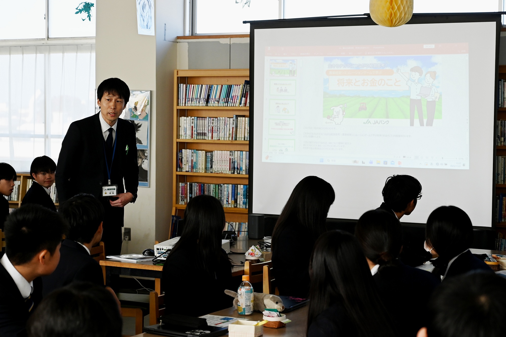 同校でのこの取り組みは24年に続き2回目。生物生産技術課の3年生68人を対象に金融業務課の新島茂樹課長補佐が講師として生徒たちに内容を説明しました。埼玉県信連の担当者も参加し授業の進行をサポートしました。
