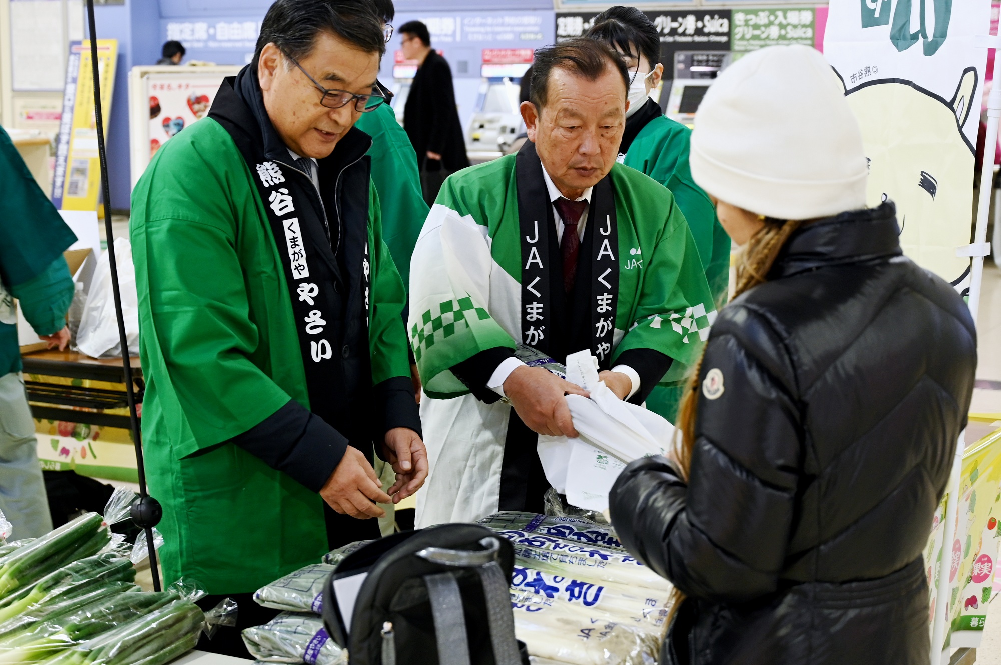 駅の利用者に対して熊谷産農産物のPRを図ることが目的で、JAから吉田公一組合長、熊谷市から小林哲也市長が参加しました。