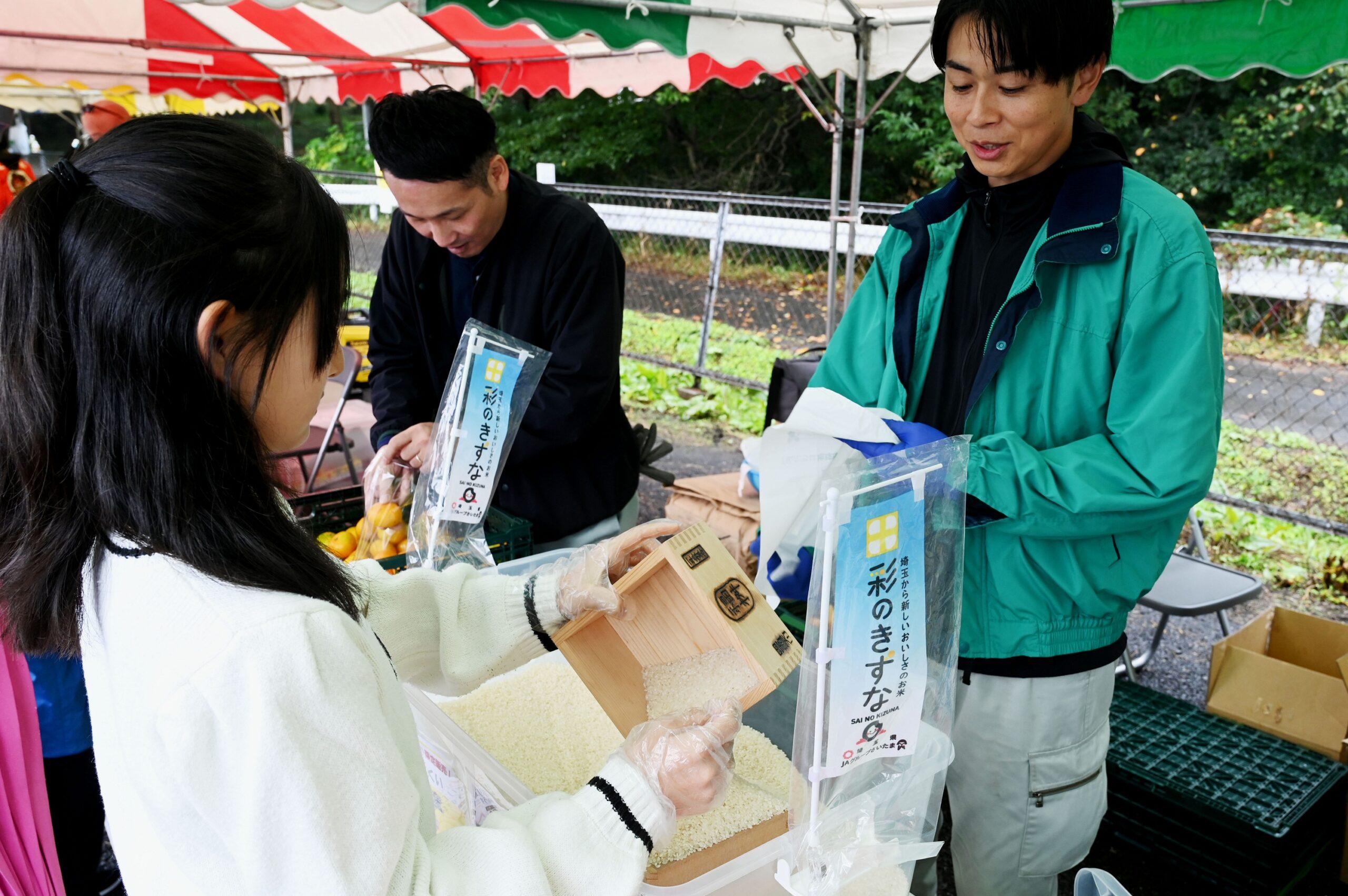 当日は、地元で生産されたキュウリ、大根、青パパイアや、同地区の特産品である栗をPRしながら販売。また、熊谷産の新米「彩のきずな」の一升桝を使った掬いどりを行い好評でした。