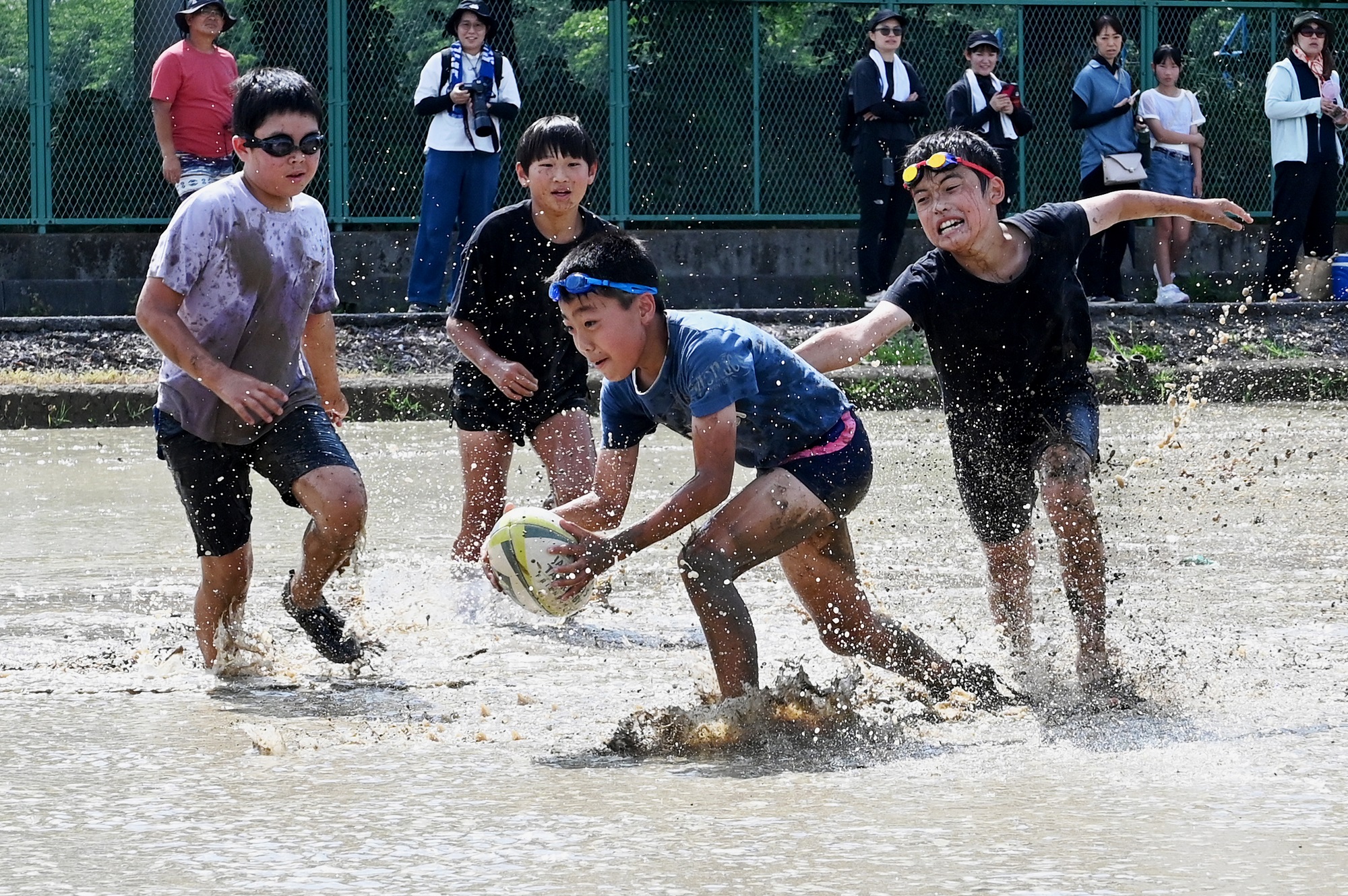 試合は1試合5分の特別ルールで行い、全13チームが参加しました。タグを田んぼの中に落とすと見つからなくなってしまうため、今回からタッチにルールを変更。参加した選手たちは泥を跳ね上げながら田んぼを駆け巡り、イベントは大いに盛り上がりました。