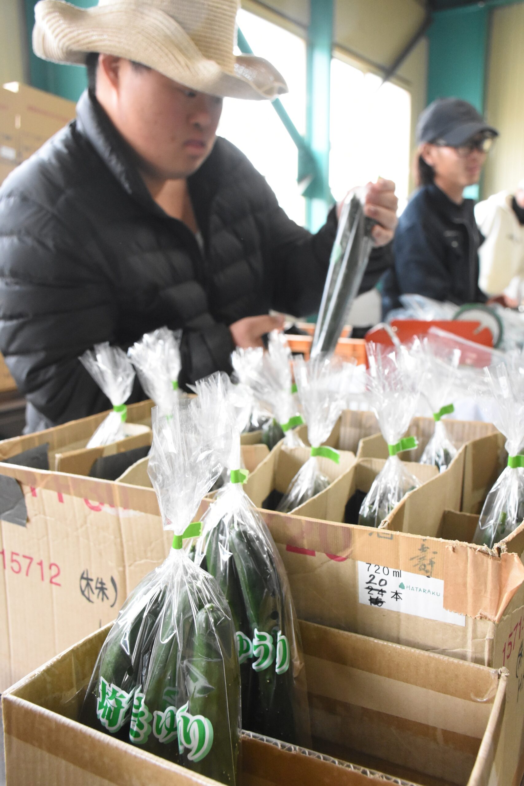 キュウリの袋詰め作業は12月中旬頃まで続く予定です。