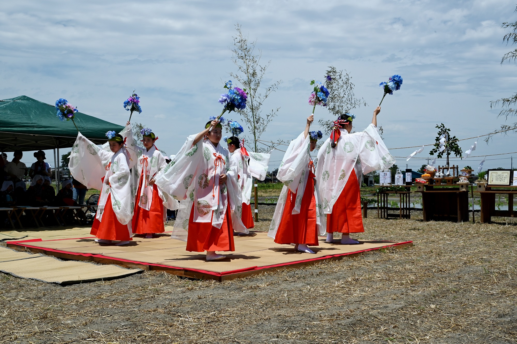 鶴岡八幡宮の分祠である三ヶ尻八幡神社への参詣後、神饌田に移動し御田植祭を斎行。大勢の参加者を前に巫女たちが神楽を舞いました。式典の最後には19年間田主として奉仕した重田文雄氏へ鶴岡八幡宮の𠮷田茂穗宮司より感謝状が贈呈され、その後、約400人の参加者が田植えを行いました。