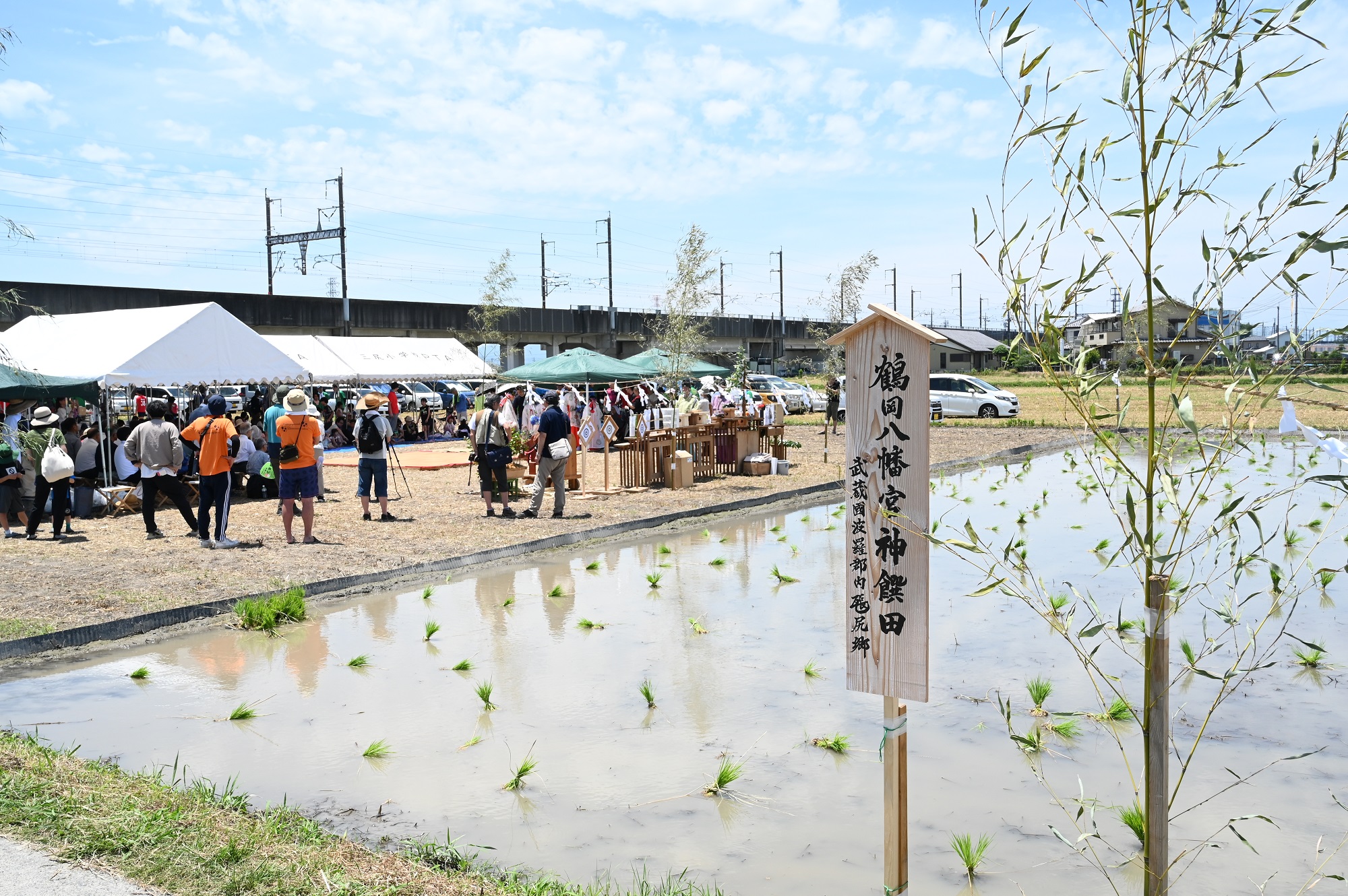 熊谷市三ヶ尻地区の鶴岡八幡宮神饌田で22日、第二十回「友好お田植え体験」が行われました。
