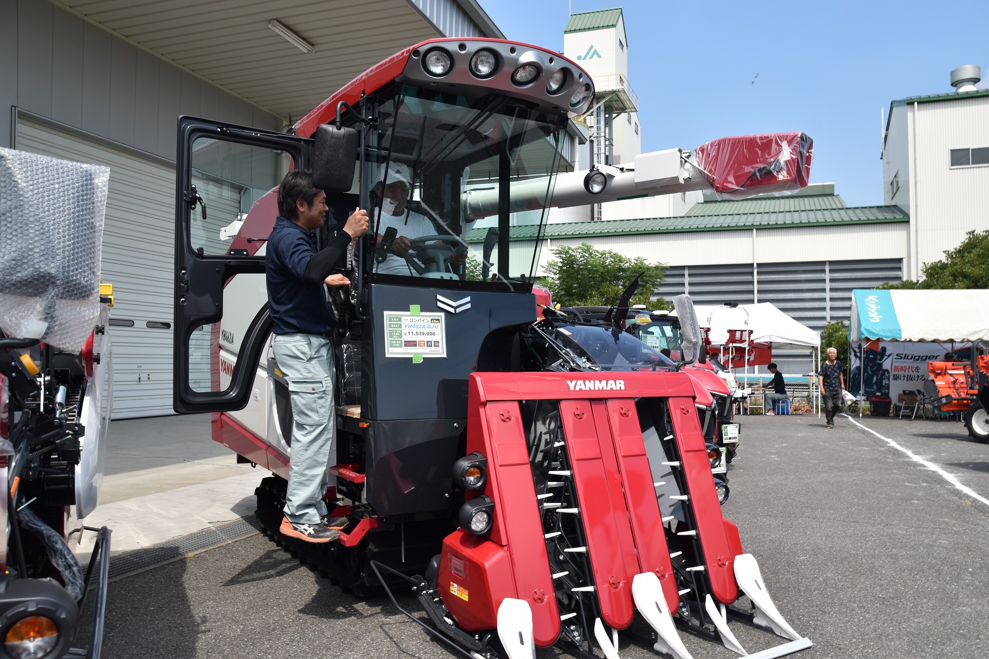 会場ではトラクター、コンバイン等の農業関連機械を展示し、JA担当者やメーカー担当者が来場者に搭載技術や操作方法を説明しました。