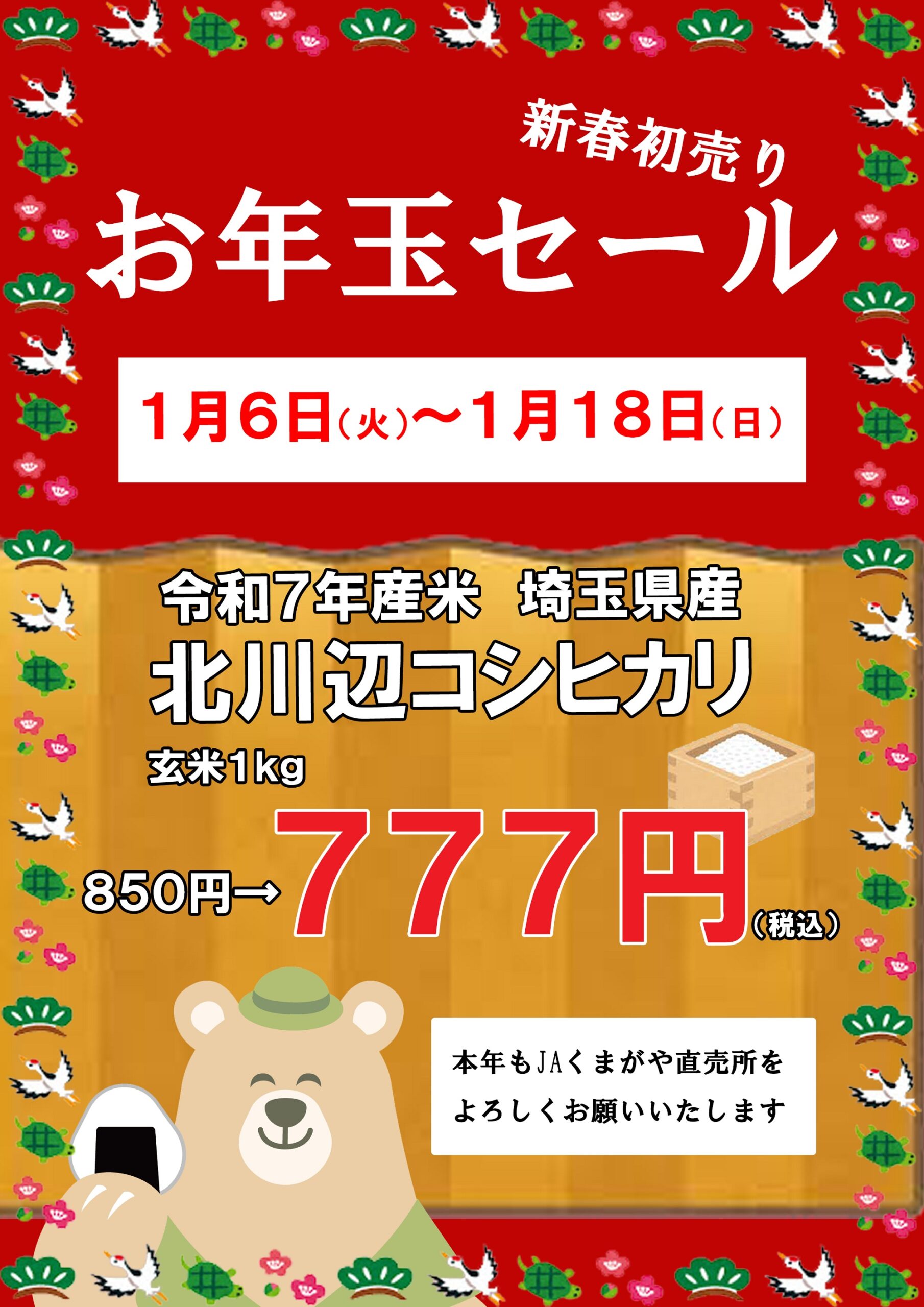 また、本日から1月18日(日)までの間「お年玉セール」と称し、令和7年産北川辺コシヒカリを特別価格で販売♪