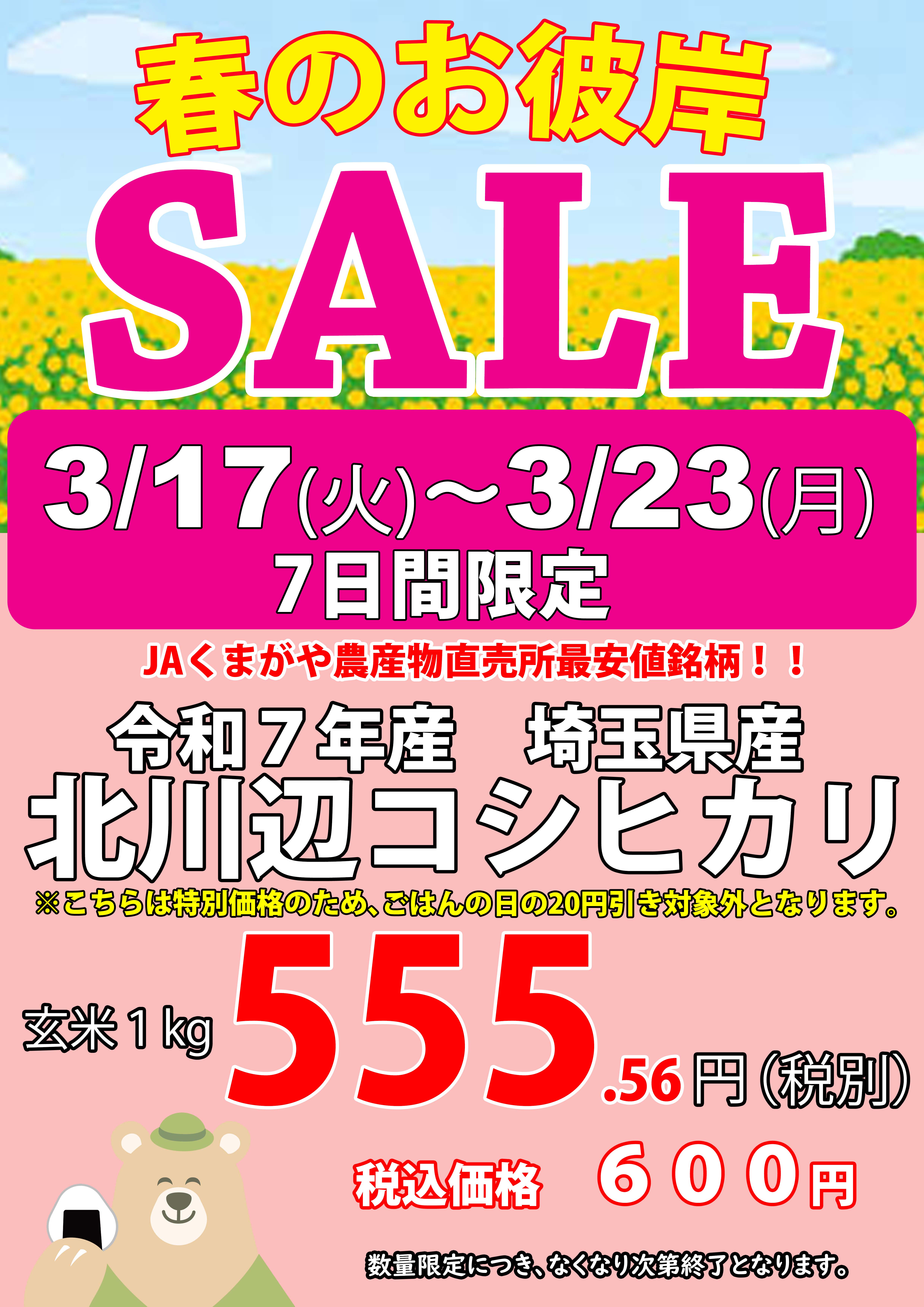 明日3/17~23の7日間限定で北川辺産コシヒカリの特売を致します。