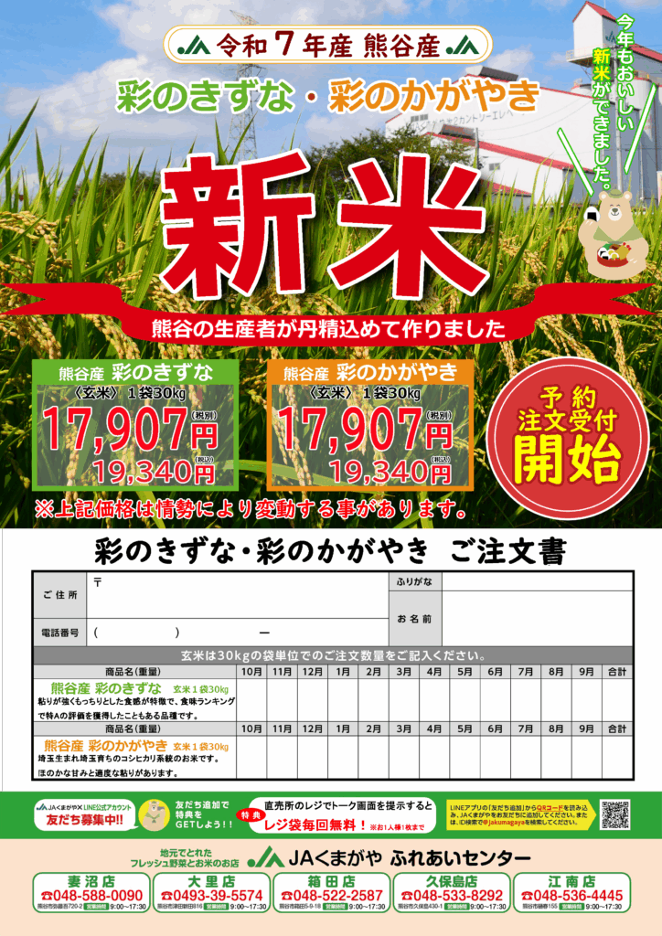 彩のきずな、彩のかがやき1袋特別価格の年間予約も開始いたしました。