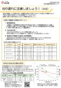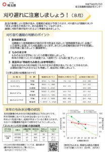 埼玉県内では、連日猛暑が続いており、水稲の生育ステージが平年と比較して前進傾向にあります。 そして、水稲の刈り遅れは「胴割れ米」や「茶米」の発生が助長され、米…